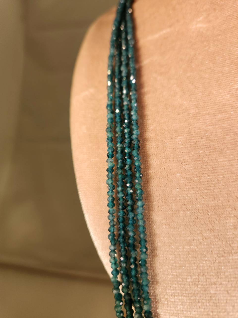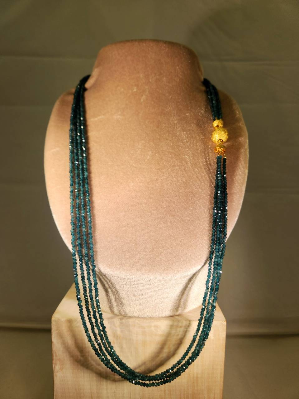 100年以上前にマダガスカルで発見され当時のマダガスカル探検家フランス人グランディデイア氏の名前が付きました。近年非常に高品質の石が採掘される様になり世界中の宝石コレクターから注目が集まりました。美しい藍色で人気です。今回はその石を小さくビーズカットしたもので大変貴重です。見た感じの色の雰囲気はアレキサンドライトにも似てるかも?長さは80cmあり頭からすっぽりと被ることが出来ます。