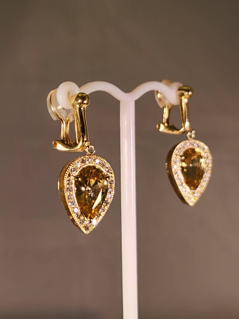 そんな珍しいイエロージルコンを使い完成した2組のイヤリングとイヤリング+ピアスは素晴らしい輝きです。メレダイヤの周りには細かく鏨で叩いたミル打ちと呼ばれるアンティーク技法も盛り込まれています。