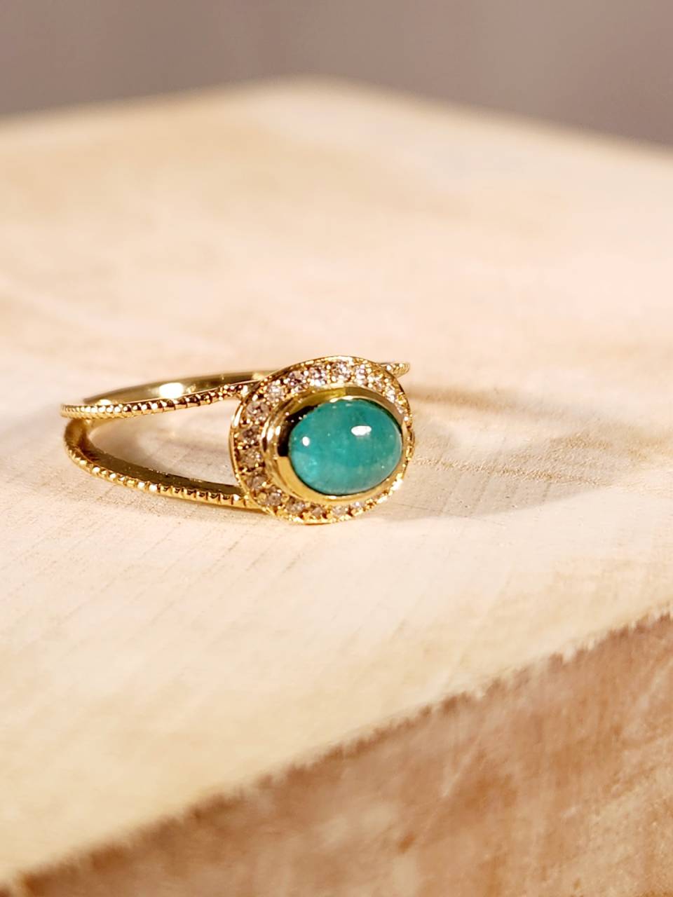 そんな中、当店のブラジルコネクションを最大限に生かして集めたパライバ裸石の数々から今回リングを一点作りました。地金の高騰の時代ですが今回は軽量でも高級感のある作りになっています。特徴はコロンとした可愛いカボションカットそして0.74ctとの近年では大きめの石のボリューム感、中石の周りには極小のダイヤメレーが光ります。