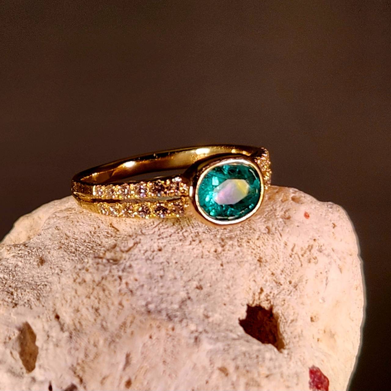 加工の段階で元々の枠が半伏せ込みという石の側面がむき出しになるタイプだったのでデリケートなエメラルドの場合、多少加工賃は上がるもののこの石には安心の地金で巻く覆輪留めをお勧めしてOKを頂き中央の石座部分のみを再加工して石を留めました。