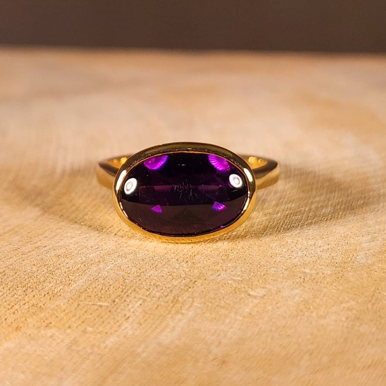 結果非常に照りもあり深みある紫色の美しいアメジストを楽しめるカジュアルなK18リングが完成しました。