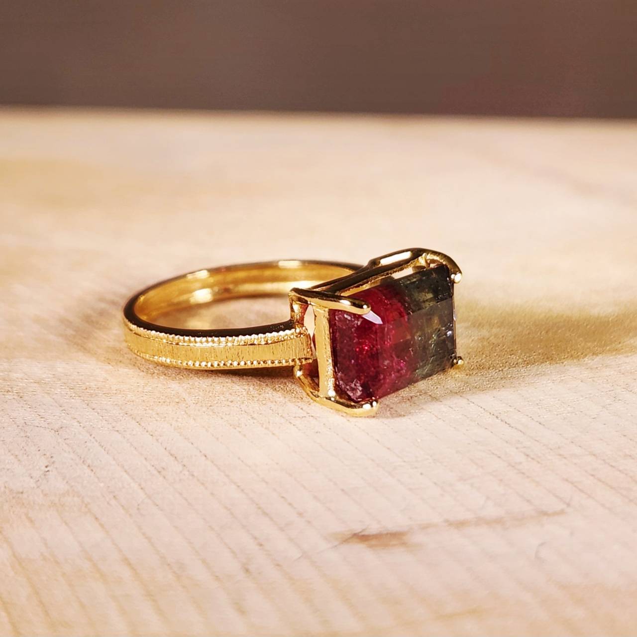 今回ブラジルで制作されたニューコレクションのひとつにこの美しいバイカラートルマリンがあります。今回は当店としては小振りで超シンプルな仕上げですがその分、腕のテクスチャー等はご覧の様にミル打ちやヘアライン等でネオアンティーク調に仕上げました。