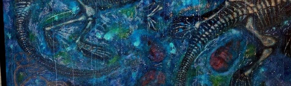 今年も出品致します。今回は恐竜の化石がボルダーオパールの様にキラキラと遊色効果を出す様になったら?と言うテーマで美しい化石を描いてみました。